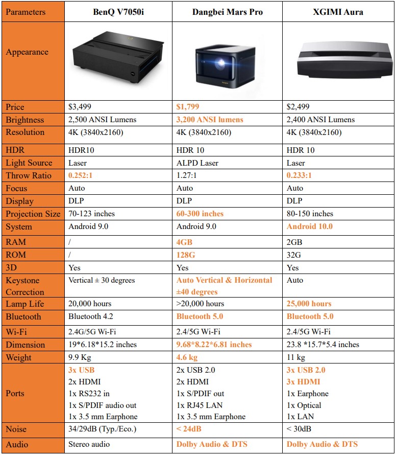 BenQ V7050i, Dangbei Mars Pro, and XGIMI Aura are all 4K laser projectors with similar market positions. What are the differences between them? The side-by-side parameter comparison may help you to know about their differences.