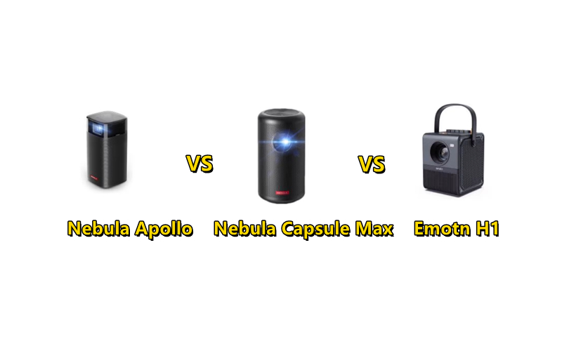 Nebula Apollo, Nebula Capsule Max, and Emotn H1 are all portable LED projectors of small size and weight. But they are different in terms of system, resolution, brightness, display technology, light source, and screen size.