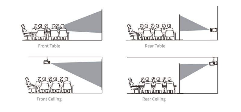 Among the 4 projection methods above, the front table is the most common way. You can just put the projector ahead of the screen or wall and then change the distance. If you adopt rear projection, a dedicated screen is needed.
