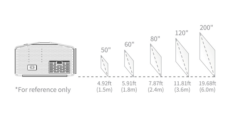 You can place the projector 1.5 meters away from the wall or screen to get a 50-inch screen. If the distance is 2.4 meters, the projection image size is 80 inches. If you want a 120-inch screen, you can put the projector 3.6 meters away from the screen.