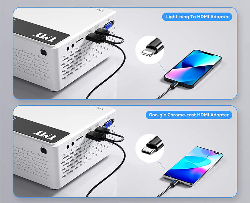 - Plug the HDMI port into the projector’s HDMI interface and plug the other end into the smartphone’s interface.