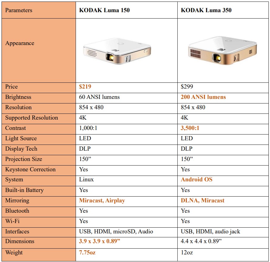 Based on the table above, we can find that the major differences between KODAK Luma 150 and KODAK Luma 350 lie in prices, size, brightness, contrast, system, and screen mirroring.