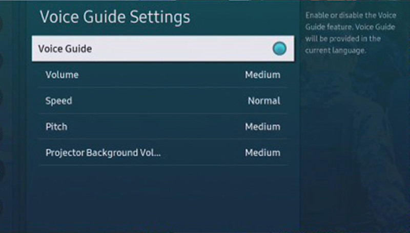 - Select Voice Guide Settings, and then select Voice Guide to toggle the feature on or off.