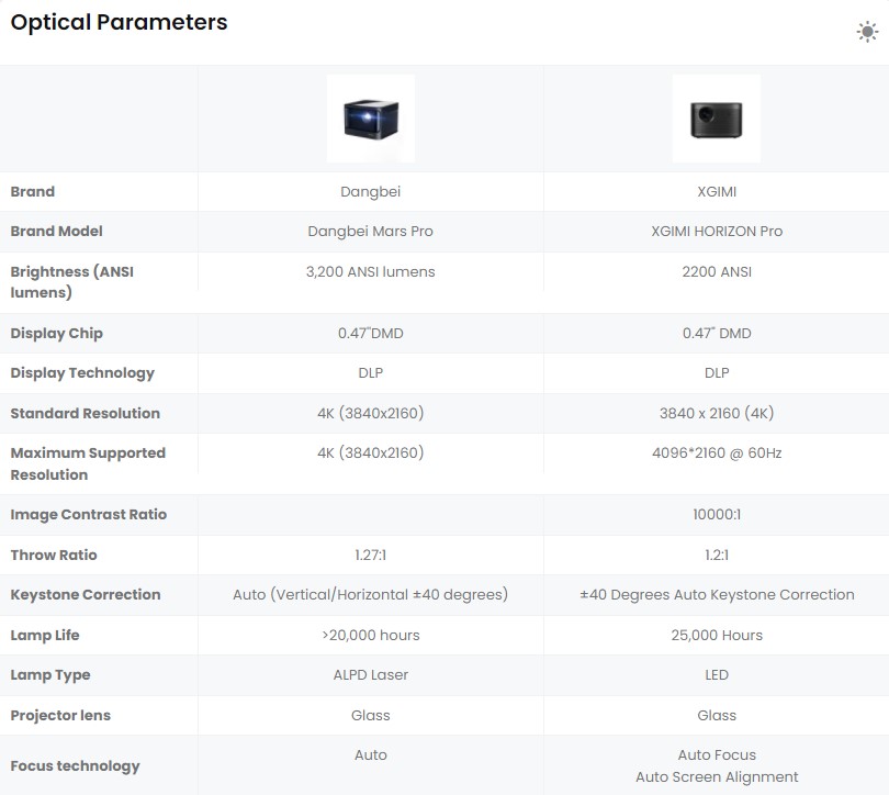 Dangbei Mars Pro and XGIMI Horizon Pro are both equipped with 0.47”DMD chip and DLP projection technology, they all can throw a diagonal 30″- 300″ image at a similar throw ratio (the former is 1.27:1 and the latter is 1.2:1). Both of them are true 4K projector with resolution of 3840 x 2160.