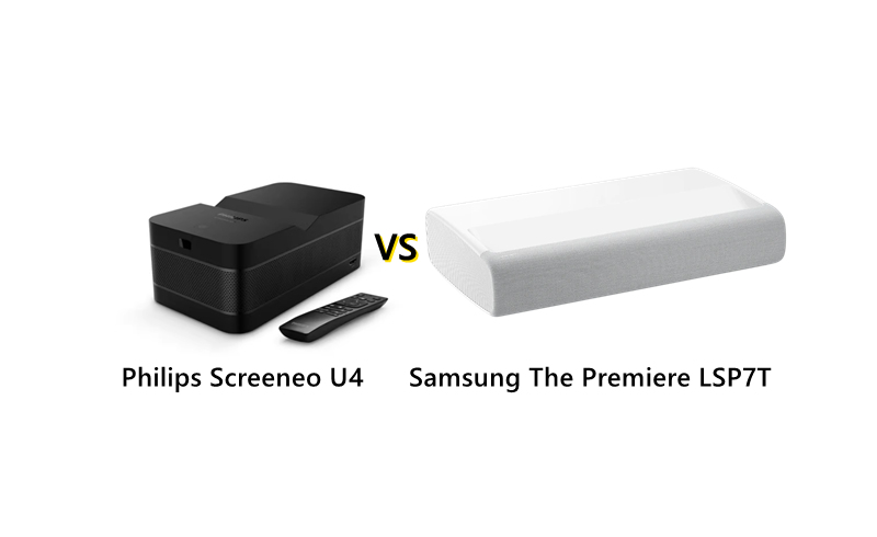 Philips Screeneo U4 and Samsung The Premiere LSP7T are both UST (Ultra Short Throw) projectors with DLP display technology. Which projector is better?
