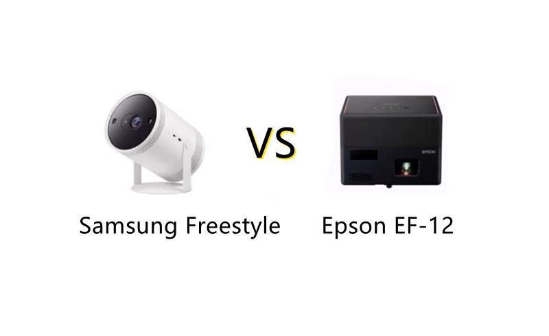 For screen size, Epson EF-12 can project a max screen of 150 inches while Samsung Freestyle has a max screen of 100 inches. Samsung Freestyle is lighter and smaller than Epson EF-12 in view of portability.