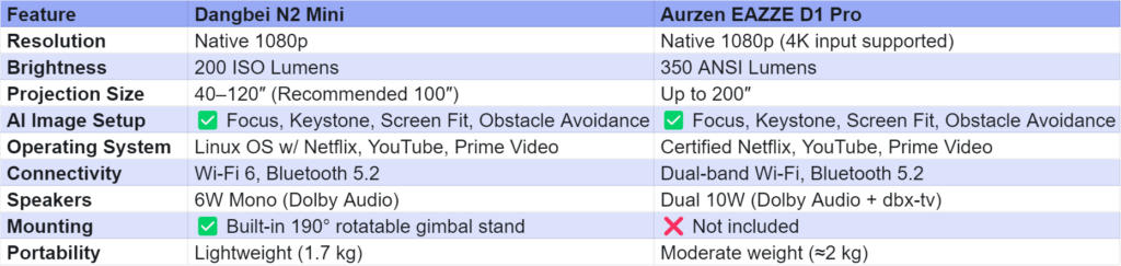 Both the Dangbei N2 Mini and Aurzen EAZZE D1 Pro are strong choices for home entertainment. But for those who prioritize smart setup, rotation flexibility, and compact design, the Dangbei N2 Mini clearly stands out. With its innovative gimbal stand, whisper-quiet operation, and support for Wi-Fi 6, it’s built for how people actually use projectors today—comfortably, creatively, and on the move.