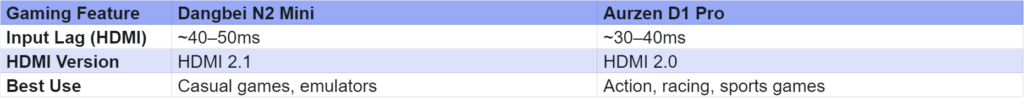 The Aurzen D1 Pro offers slightly better input responsiveness, but the N2 Mini is still a solid choice for casual gaming. Thanks to HDMI 2.1, it delivers smooth input and stable performance for most non-competitive titles.