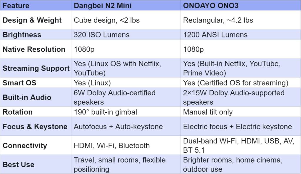 If your priority is brightness, louder speakers, and broad content access, especially in semi-lit or outdoor spaces, the ONOAYO ONO3 stands out as a powerful, Netflix-certified all-rounder.