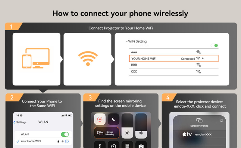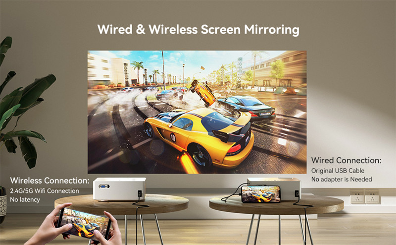 For wireless mirroring, you need to connect the projector to your Wi-Fi network and connect your smartphone to the same Wi-Fi network as the projector; then turn on the Cast/screen mirroring function on your smartphone and pick the signal of the projector to connect the two devices.