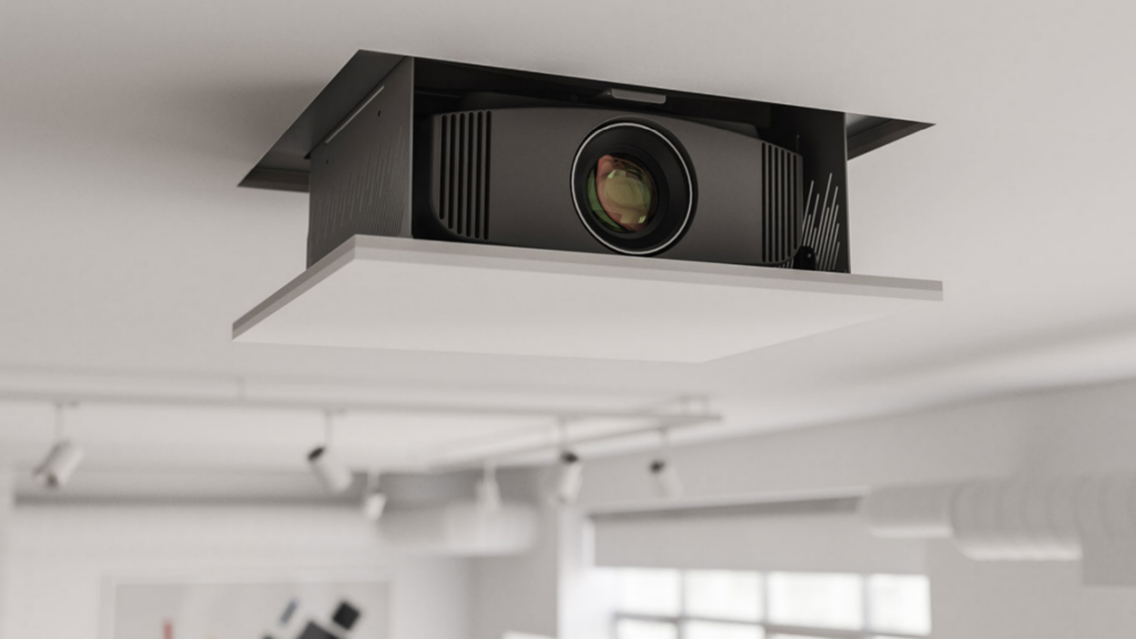 Mounting the projector on the ceiling is ideal for long-term installations. It keeps the projector out of the way and creates a clean, uncluttered look. This setup is especially useful in tight rooms where floor and shelf space are limited.