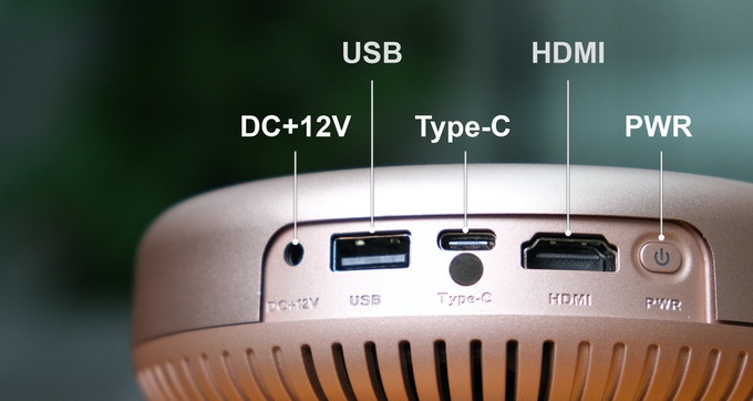 The projector has various interfaces, including DC, USB, Type-C, HDMI, and PWR interfaces, supporting various connections, such as mobile phones, tablets, and tablets.