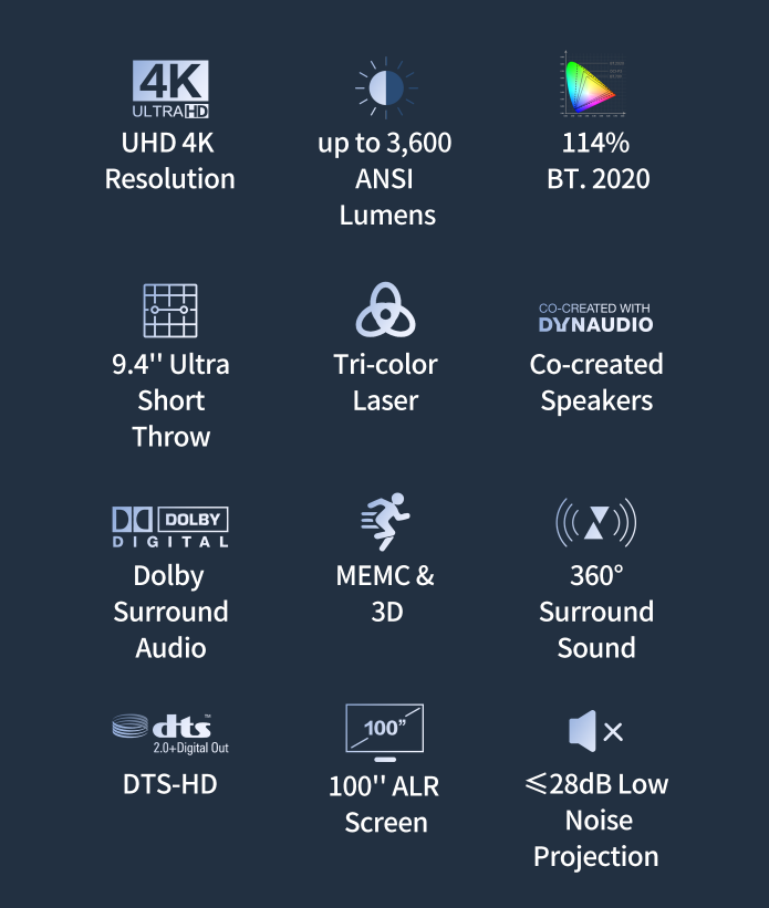 JMGO U2, a best-in-class 4K projector with cutting-edge tri-color laser technology, unrivaled surround sound, and stunning design, delivers a full home theater experience in the truest sense.