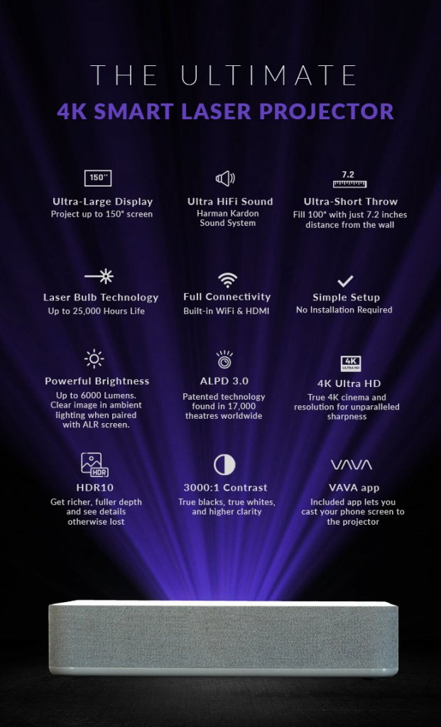 VAVA 4K Short-Throw Laser Projector gives you a stunning 4K image up to 150″ display. Get a HUGE image from only 7.2 inches away!