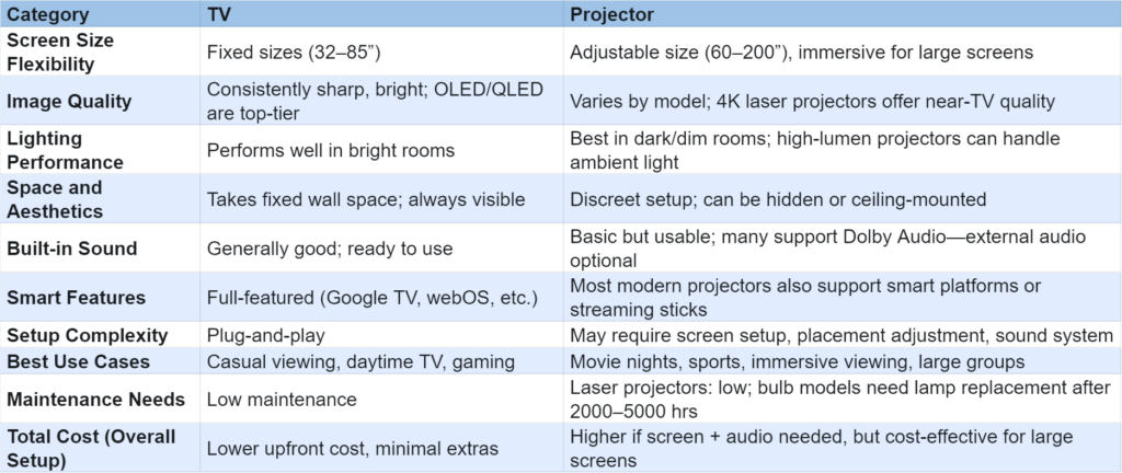 Conclusion: TVs provide solid audio right out of the box. Projectors come with decent built-in sound and offer flexibility to upgrade for immersive soundscapes.