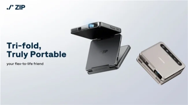 Under its ultra-compact frame, the ZIP is packed with advanced features. The first fold houses the world’s thinnest 8mm HD optical engine and a mini DLP chipset, ensuring crisp, vivid visuals. The second fold integrates dual high-carbon steel hinges for adjustable projection angles and includes ultra-thin stereo speakers for an immersive audio experience. The third fold features a built-in high-capacity battery, anti-slip base, and support for PD fast charging—allowing projection without a power cable.