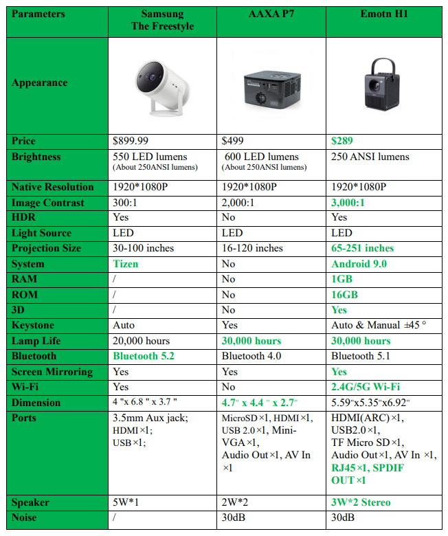 Compared with AAXA P7, Samsung The Freestyle and Emotn H1 are obviously better in terms of system and smart features. Samsung The Freestyle is apparently more expensive than the other two models.