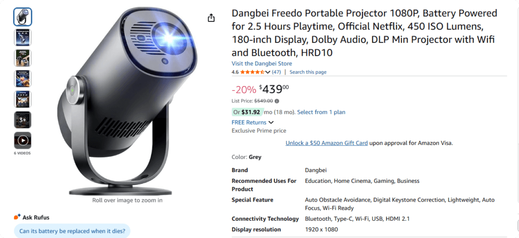 The Dangbei Freedo stands out for its impressive portability and ease of use. After the initial setup, it’s almost plug-and-play. This projector has a built-in battery that supports approximately 2.5 hours of continuous use—enough for a movie night without needing to plug it in. Alternatively, you can use the USB-C port to charge it, making it even more convenient.