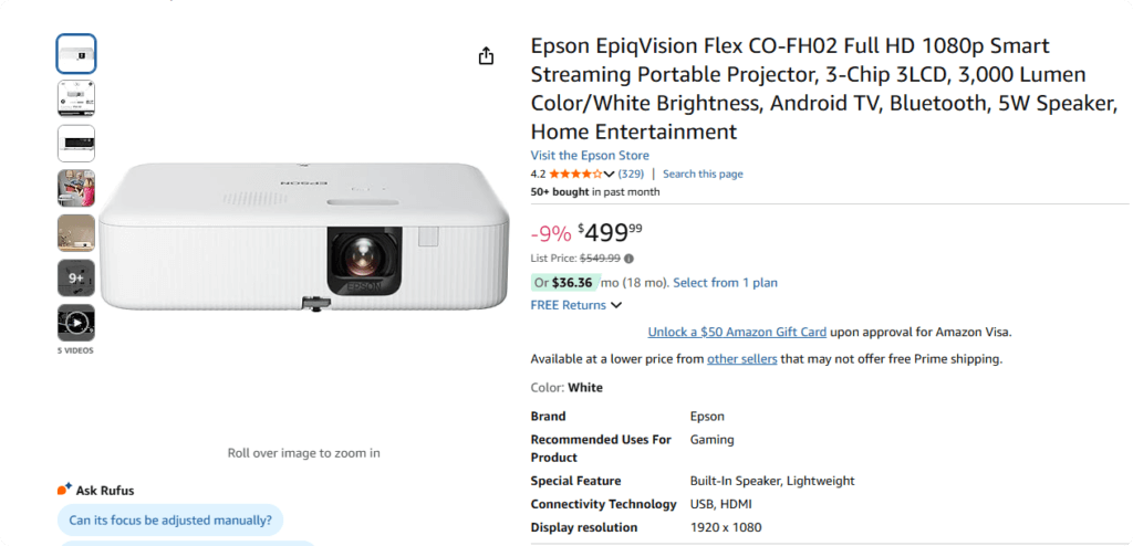 Epson EpiqVision Flex CO-FH02 – $499 on Amazon